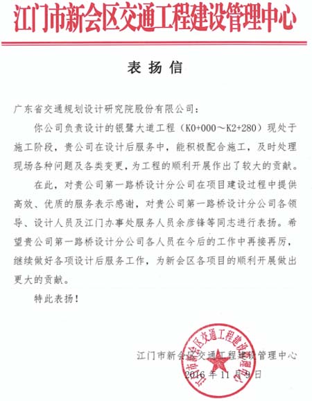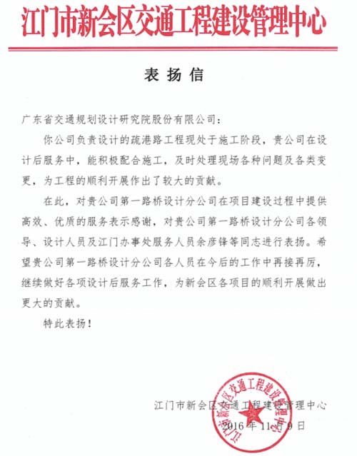 近日,江門市新會區(qū)交通工程建設(shè)管理中心發(fā)來表揚信,對我司在疏港路工程、銀鷺大道工程(K0+000~K2+280)、省道S270線新會西甲村至大洞村段路面改造工程幾個項目中提供的優(yōu)質(zhì)、高效的設(shè)計后服務(wù)表示贊揚,同時對負責這幾個項目的第一路橋設(shè)計分公司等組織和個人給予通報表揚。特此報喜!
