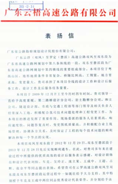 近日,廣東云梧高速公路有限公司發(fā)來表?yè)P(yáng)信,高度肯定我司在云羅高速公路項(xiàng)目中提供的優(yōu)質(zhì)、高效的設(shè)計(jì)后服務(wù),對(duì)第二路橋設(shè)計(jì)分公司、巖土勘察分公司、和立公司、隧道設(shè)計(jì)部和市政與交通設(shè)計(jì)部組建的設(shè)計(jì)后服務(wù)團(tuán)隊(duì)的工作表示感謝。同時(shí)點(diǎn)名表?yè)P(yáng)了劉烜、車競(jìng)、王成中等一批設(shè)計(jì)代表。目前,該項(xiàng)目已建成通車。