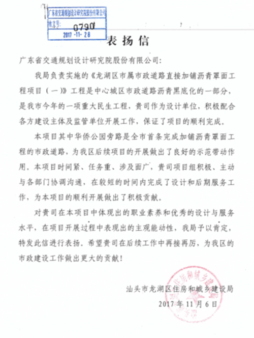 近日,汕頭市龍湖區(qū)住房和城鄉(xiāng)建設(shè)局發(fā)來(lái)表?yè)P(yáng)信,對(duì)我司在龍湖區(qū)市屬市政道路直接加鋪瀝青罩面工程項(xiàng)目(一)中提供的優(yōu)質(zhì)、高效的設(shè)計(jì)及后服務(wù)表示感謝,對(duì)負(fù)責(zé)此次項(xiàng)目的市政設(shè)計(jì)分公司及項(xiàng)目團(tuán)隊(duì)給予了充分肯定,特此報(bào)喜!