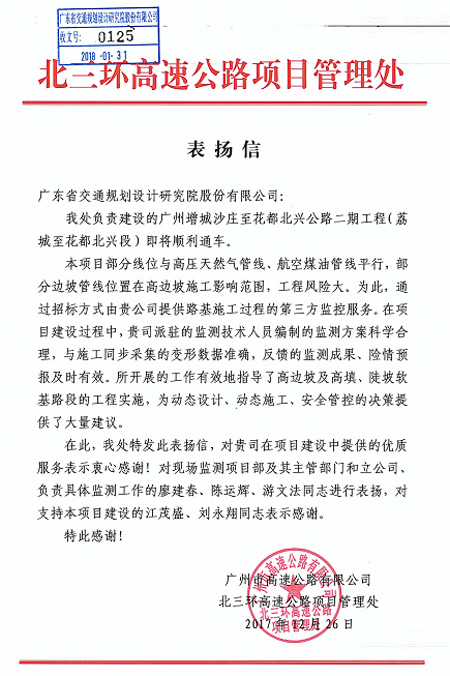 近日,北三環(huán)高速公路項(xiàng)目管理處發(fā)來表揚(yáng)信,對(duì)我司在廣州增城沙莊至花都北興公路二期工程(荔城至花都北興段)項(xiàng)目中提供優(yōu)質(zhì)服務(wù)表示肯定,對(duì)負(fù)責(zé)該項(xiàng)目的和立公司及其相關(guān)負(fù)責(zé)人江茂盛、劉永翔,技術(shù)人員廖建春、陳運(yùn)輝、游文法給予了通報(bào)表揚(yáng),特此報(bào)喜!