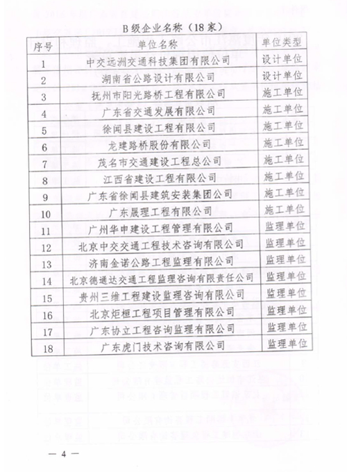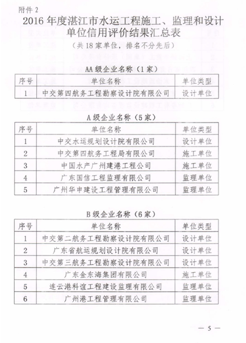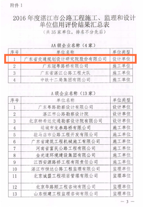 近日,湛江市交通運輸局公布了2016年度湛江市公路水運工程從業(yè)單位信用評價結(jié)果。我公司榮獲2016年度湛江市公路工程施工、監(jiān)理和設(shè)計單位信用評價AA級企業(yè)。 信用評價是企業(yè)履行質(zhì)量承諾能力的證明,是企業(yè)對外經(jīng)營的有效“通行證”。此次評價進一步反映了我公司的設(shè)計質(zhì)量得到了市場認(rèn)可。