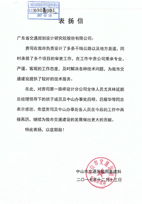 近日,中山交通運輸局基建管理科發(fā)來表揚信,對我司在中山市承擔的多個公路項目設計及審查工作表示肯定,肯定我司不斷深入市場一線,秉承專業(yè)、嚴謹?shù)墓ぷ鲬B(tài)度,提供及時、優(yōu)質(zhì)的技術服務,為中山市交通建設的發(fā)展作出了積極貢獻。同時,對負責該項目的第一路橋設計分公司及班子成員、中山辦事處呂明、呂耀華給予了通報表揚。特此報喜!