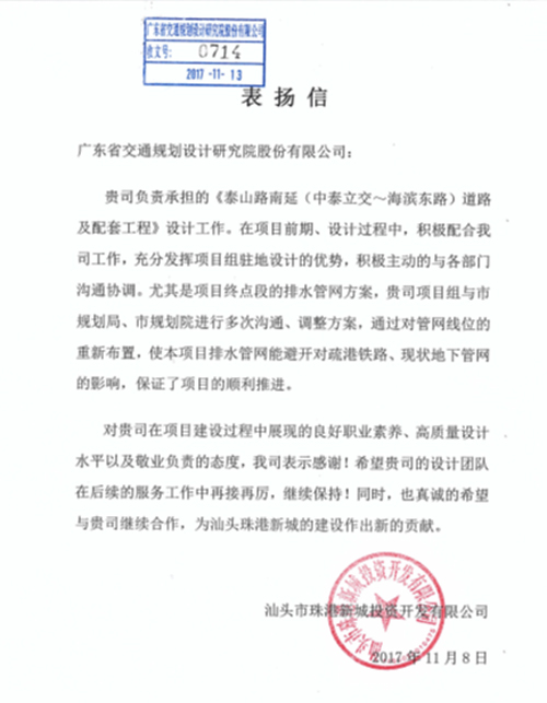 近日,汕頭市珠港新城投資開發(fā)有限公司發(fā)來表揚信,對我司在泰山路南延(中泰立交—海濱東路)道路及配套工程項目中提供的優(yōu)質(zhì)、高效、全面的設(shè)計及后服務(wù)表示感謝,對負(fù)責(zé)此次項目的市政設(shè)計分公司及項目團隊給予了充分肯定,特此報喜!