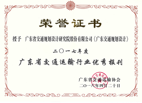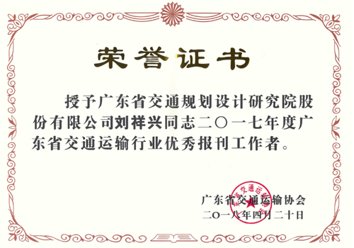 我公司報刊《廣東交通規(guī)劃設計》被廣東省交通運輸協(xié)會評為2017年度廣東省交通運輸行業(yè)優(yōu)秀報刊,技術(shù)質(zhì)量部劉祥興副主任被評為2017年度廣東省交通運輸行業(yè)優(yōu)秀報刊工作者。特此報喜!