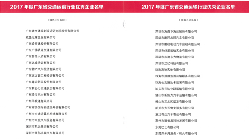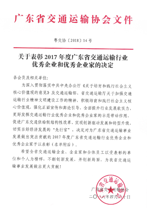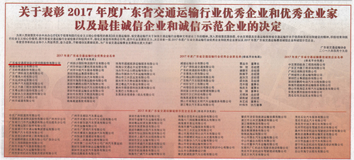 4月20日,廣東省交通運(yùn)輸協(xié)會(huì)表彰了2017年度廣東省交通運(yùn)輸行業(yè)優(yōu)秀企業(yè)。經(jīng)專家審定,我公司榮獲廣東省交通運(yùn)輸行業(yè)優(yōu)秀企業(yè)。特此報(bào)喜!