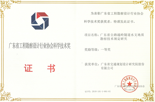 《廣東省公路越嶺隧道水文地質(zhì)勘察技術(shù)規(guī)定研究》榮獲一等獎,獲獎人員:李水清、李紅中、張修杰、王軍、王強(qiáng)、鄧超文、李樹茂、張金平、林少忠、劉祥興;